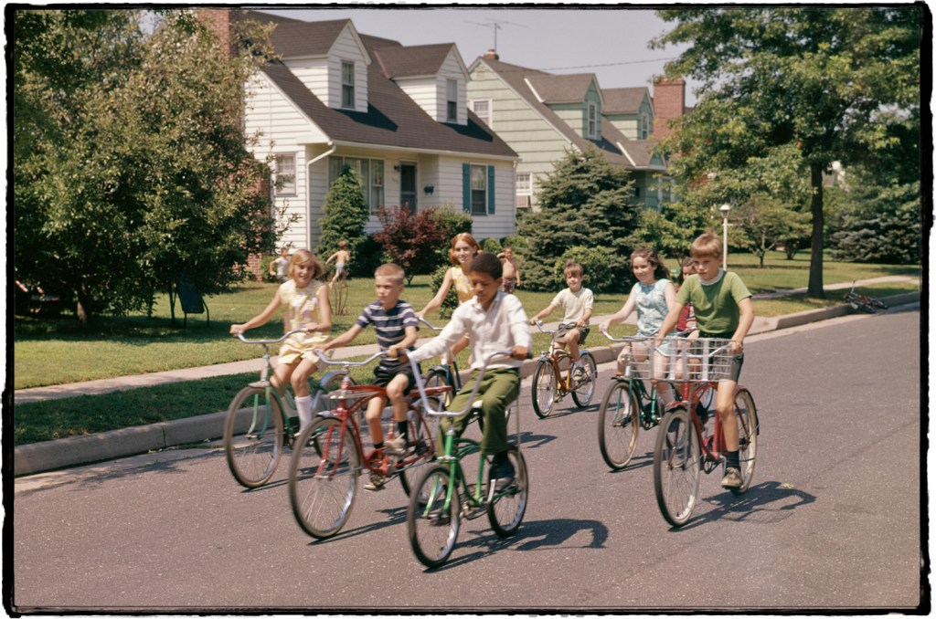 Neighborhood children riding bikes down a suburban street in the 1960s pre-helmet era.
