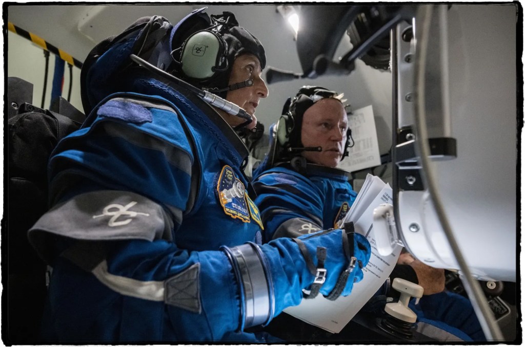 NASA astronauts Suni Williams and Butch Wilmore during Suited EMER SIM Operations in the Boeing Starliner spacecraft simulator at NASA’s Johnson Space Center (Credit: NASA/Robert Markowitz).